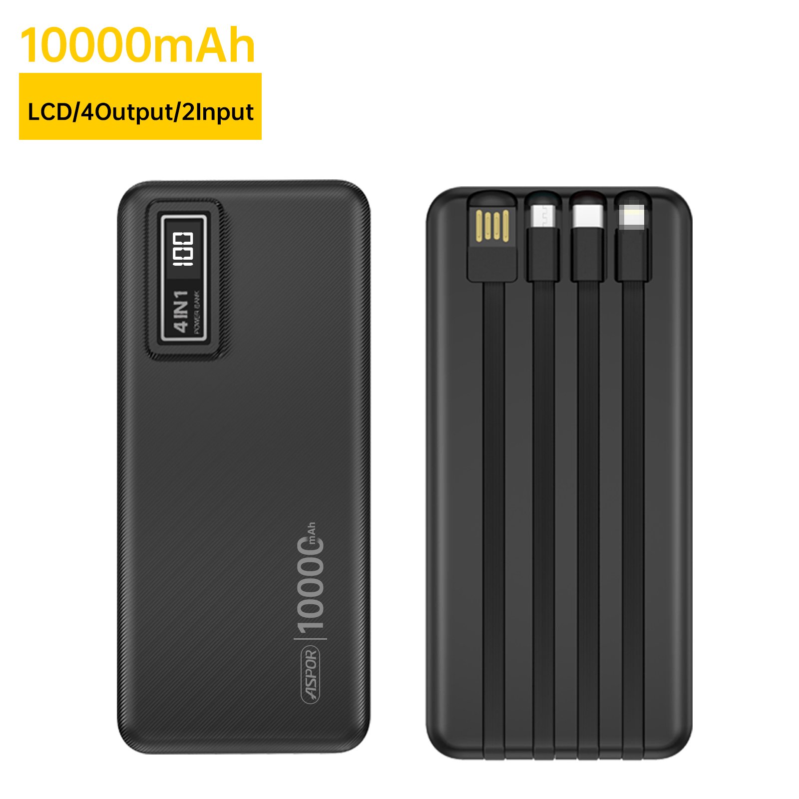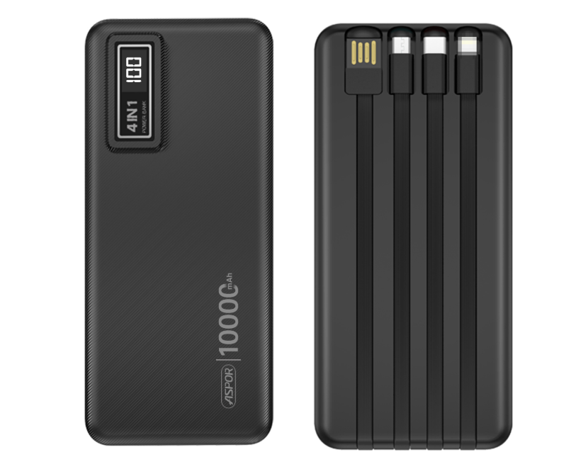 Powerbank ASPOR A300 10 000 mAh avec câbles intégrés 4-en-1, charge rapide et sécurisée pour smartphones, tablettes et autres appareils électroniques, idéale en déplacement.